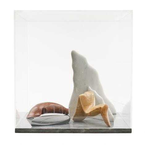Jørgen Haugen Sørensen: “Den lille katolske”. Signed with monogram 1975, 3/9. A marble and stone sculpture group. H. 35 cm. (6)