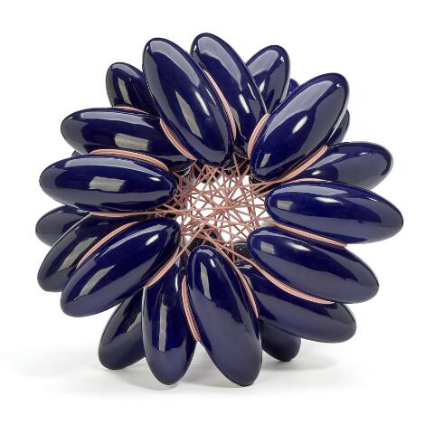 Steen Ipsen: "Ellipse 7/2024", 2024. Signeret Ipsen 2024. Mørkeblåt glaseret lertøj med pink PVC. H. 35 × B. 38 × D. 27 cm.