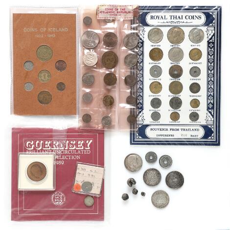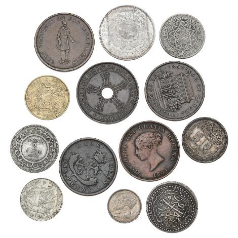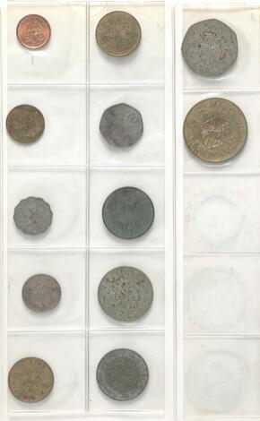 Small collection of foreign coins and bank tokens, in total 13 pcs