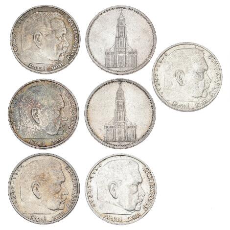 Germany, 5 Reichsmark 1935 A (2), 1935 A, 1935 D, 1936 A, 1937 J, 1938 E, KM 83, 86, 94. (7)