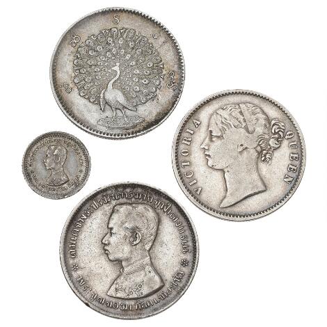 Burma, Kyat 1852, KM 10, Thailand, Fuang (1/8 Baht) ND (1876-1900), KM Y32, Baht ND (1876-1900), KM Y34, and East India Company, 1 Rupee 1840, KM 458