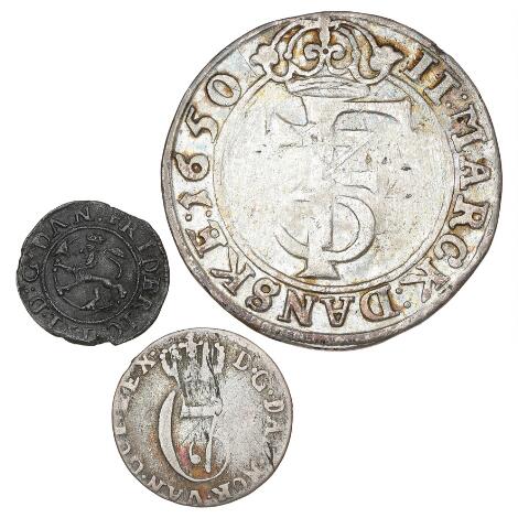 2549/5212Norge, Frederik III, 2 mark 1650, NMD 150, ridser, skilling 1669, NMD 252; Christian VII, 2 skilling 1780, NMD 78A, i alt 3 stk.