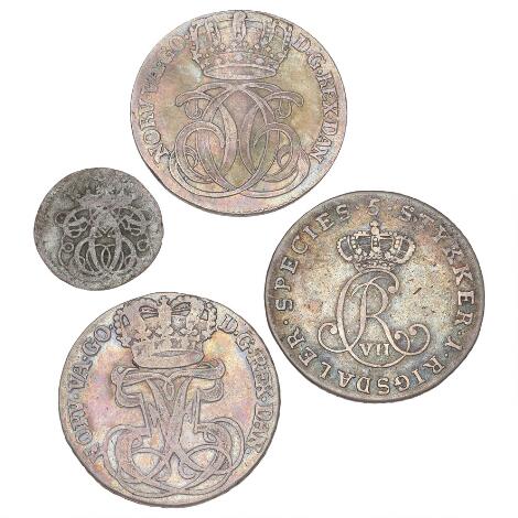 2549/5216Norge, Christian V-Christian VII, lille samling mønter, i alt 4 stk.
