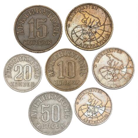 2549/5209Norge, Spitsbergen, 10, 15, 20 og 50 Kopeks 1946, KM Tn1–4, og Svalbard, Arcticugol, 10, 25 og 100 Rubler 1993, KM Tn5–6 og 8, i alt 7 stk