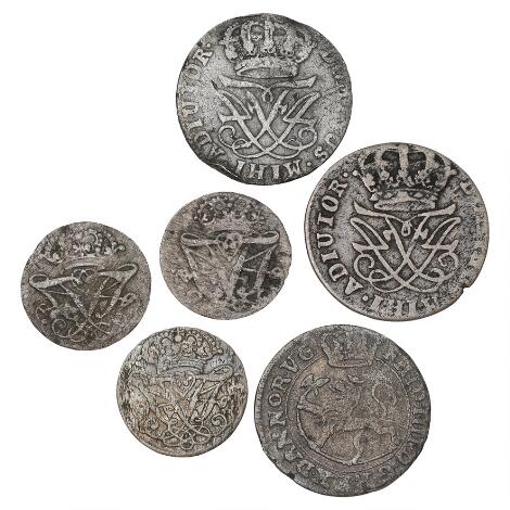 2549/5218Norge, Frederik IV, 12 skilling 1720, 1723, H 15, 8 skilling 1727, H 17A, 2 skilling 1708 (2), 1717, H 7A, 7B. (6)