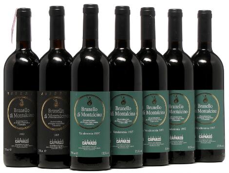 2 bts. Brunello di Montalcino Riserva, Caparzo 1995 A/B (ts). etc. Total 7 bts.