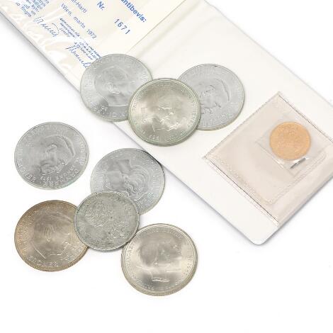 Margrethe II, H.M. King Frederik IX commemorative medal, 1972, Au, 3.5 g 900/1000, in original cover, as well as commemoratives (8 pcs), in total 9 pcs