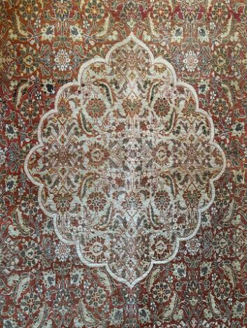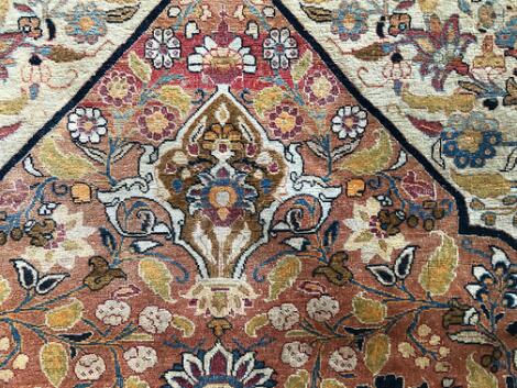 Keshan tæppe, Persien. Medaljondesign på lys bund prydet med palmetter, rosetter og bladværk. 20. årh.s første halvdel. 500 x 320.
