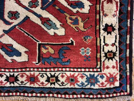 Antikt Chelaberd tæppe, Kaukasus. Klassisk design som går under betegnelsen Ørne-kasak eller "sunburst" Kasak. Ca. 1890-1920. 214 x 126.