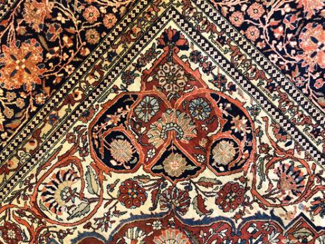 Antikt Bakshaish tæppe, Nordvest Persien. Dekorativt design med stiliserede palmetter, rosetter, slyngede grene og bladværk. 19. årh. 340 x 290.