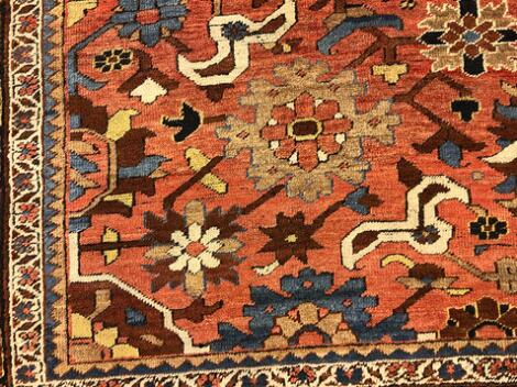 Antikt Baktiari tæppe, sydvest Persien. Design med central ornament med djævel der understøtter borg. 20. årh.s begyndelse. 441 x 323.