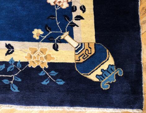 Kina tæppe, enkelt design med central blomsterroset på åben blå bund med spredte ornamenter i form af sommerfugle, kviste og blomsterhoveder. 545 x 360.