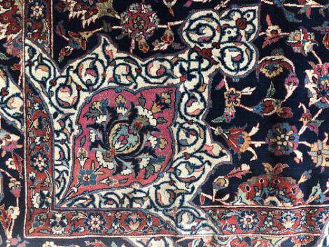Keshan tæppe, Persien. Medaljondesign på blå bund med palmetter, blomster og bladværk, borter med lyse slyngede bånd. C. 1950. 430 x 313.