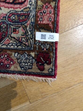 Bidjar tæppe, Persien. Enkelt medaljondesign på rød bund. Knyttet på uldkæde. 20. årh.s begyndelse. 360 x 229.