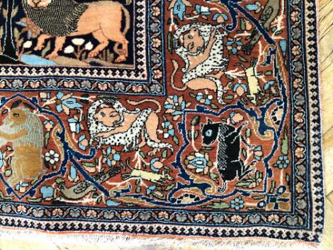 Signeret Seirafian Isfahan tæppe, Persien. Design med klassisk jagtsceneri på lys bund. Knyttet med korkuld på silkekæde. Ca. 1960-1970. 177 x 105.