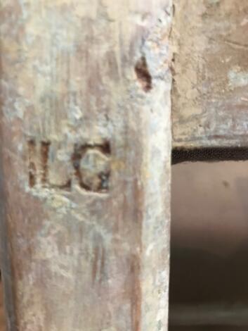 Fransk langbord af egetræ med rester af bemaling, profilerede side stykker, hvor imellem sprosse. 19. årh.s midte. H. 75. L. 260. B. 93.