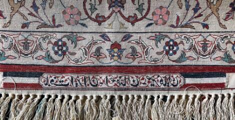 Signeret helsilke Qum tæppe, Persien. Medaljondesign på lys bund prydet med blomster og bladværk. Ca. 1 mio. kn. pr. m2. Ca. 2000. 195 x 132.