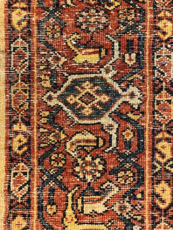Antikt Heriz tæppe, nordvest Persien. Design med lille medaljon med vedhæng på terracottafarvet bund prydet med slyngede bånd. 20. årh.s begyndelse. 393 x 279.