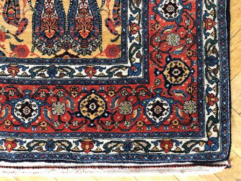 Senneh tæppe, Persien. Dobbelt boteh design på gul bund. Knyttet på silkekæde. C. 2000. 230 x 170.