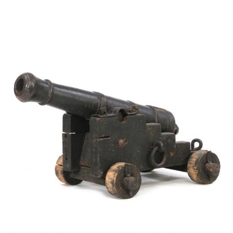 Dækskanon på original rappert. Kanonen i støbejern har et ca. 85 cm. lang rør inkl. druen i kaliber ca. 53 mm. 19. årh.