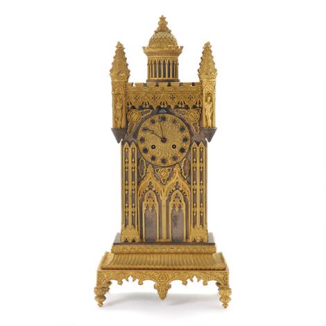 Frisard á Rouen: Fransk kaminur af forgyldt og patineret bronze, i form af tårn i gotisk stil. 19. årh.s midte. H. 57. B. 27. D. 14.