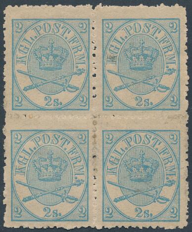 1864. 2 sk. blue, (1870) line-perforated 12 1/2. Unused block of FOUR. AFA: 10800+. Certifcate Kaiser.
