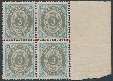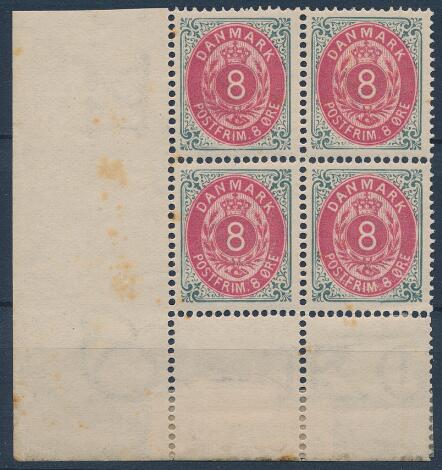 1875. 8 øre, aniline. Block of four with 3 nh stamps.