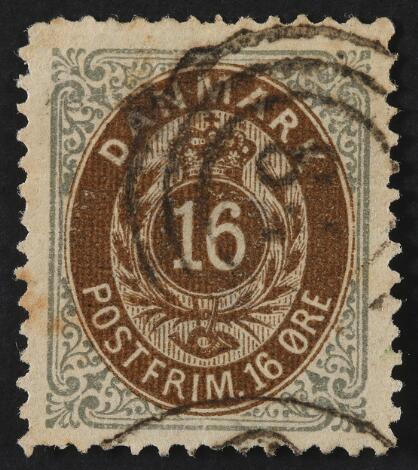 1875. 16 øre, 1.print, pos. 77 INVERTED FRAME. Used copy. Rare. AFA 4500. Cert. Nielsen