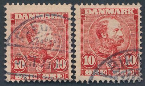 1904. Chr. IX, 10 øre, red. Pos. 6 with variety "Retouch near kings head". Enclosed also copy from pos. 7. Scarce