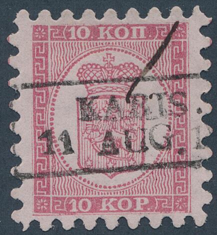 1860. Coat of Arms, 10 Kop, red. SUPERB copy with perfect centring and perforation