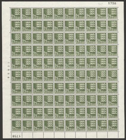 1962. 25 kr. green. Normal paper. Perfect unfolded full sheet. Margin no. 1758. AFA 24000+