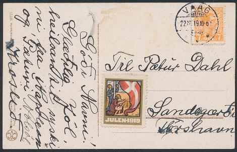 1919. 7 øre, Chr.X, orange. Single on postcard from VAAG 11.12.19, to Thorshavn.
