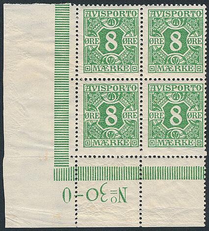 1914. 8 øre, green. Vmk.Kors. Lower nh block of four with corner-margin "No 30-0". AFA: 6000 (for upper block).