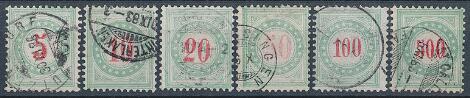 Switzerland. Postage due. 1883. 5-500 C. green/red. Complete set with inverted frame (Michel Speciel 17-22 II A X a K: EURO 698