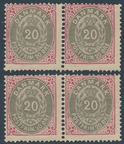 1875. 20 øre, grå/rød. Postfrisk, vandret adskilt "4-blok" (2 vandrette parstykker). AFA: 10800+. Attest Nielsen