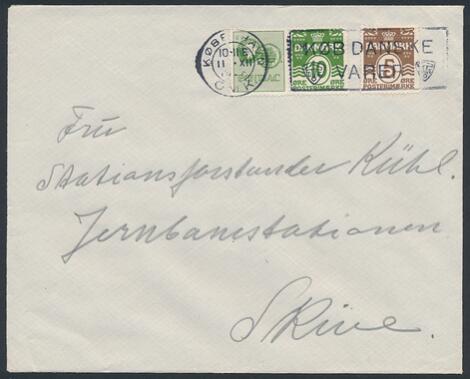 1928. Pontiac, 10 øre, grøn. Parstykke på brev med Bølgelinie, 5 øre, brun. Korrekt frankeret forsendelse fra København 11.12.1928. AFA 7000