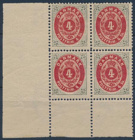 1870. 4 sk. grå/rød. Postfrisk nedre HJØRNEMARGINAL 4-BLOK. Let splittet vandret perforering, men ellers en meget smuk blok. AFA: 10000+