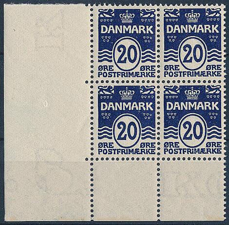 1912. Bølgel. 20 øre sortblå. Perfekt postfrisk nedre HJØRNEMARGINAL 4-BLOK. AFA: 11200+