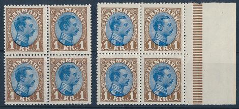 1921. Chr. X, 1 kr. brun/blå tp. I og II. Begge typer i postfriske 4-BLOKKE. AFA: 9400+
