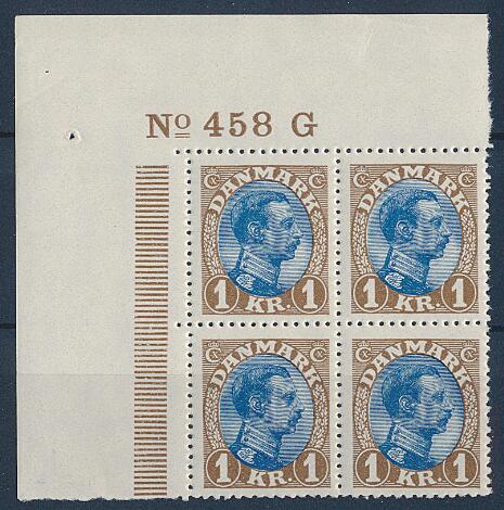 1921. Chr. X, 1 kr. brun/blå tp. II. Øvre postfrisk HJØRNEMARGINAL 4-BLOK "No 458-G". AFA: 7000