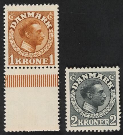 1913. Chr.X, 1 kr. gulbrun og 2 kr. skifergrå. Flot postfrisk sæt