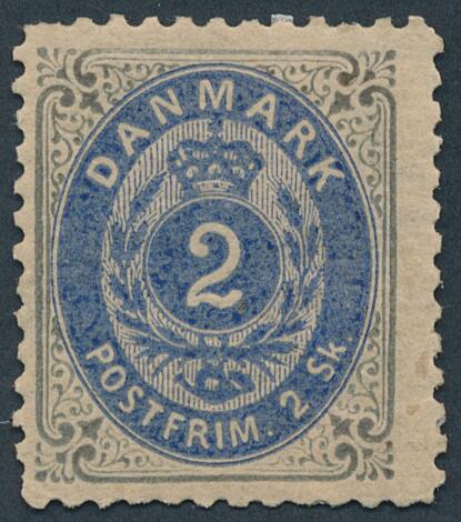 1870. 2 skilling, grå/blå. LINIETAKKET 12 1/2. Fint og farvefriskt ubrugt mærke, hængslet med fuld original gummi. AFA: 19000. Attest Nielsen.
