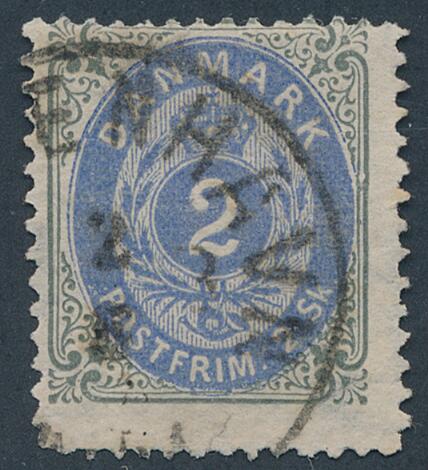 1870. 2 sk. grå/blå. OMVENDT RAMME. Pænt stemplet mærke med lille lukket rift i nedre marginal