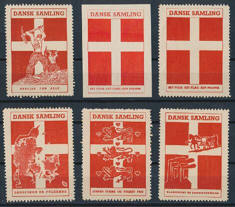 Mærkater. "Dansk Samling". Lot med 6 forskellige propagandamærkater. Sjældne