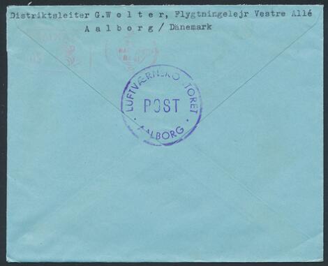1948. Brev fra Flygtningelejr i Aalborg med violet stempel på bagsiden "LUFTVÆRKSKONTORET AALBORG POST".