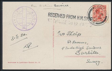 1920. Skibskort fra Danmark til England med 10 øre, Chr.X, rød, med ENGELSK stempel LONDON 6 AU 20 og sort liniestempel "RECEIVED FROM H.M.SHIP."