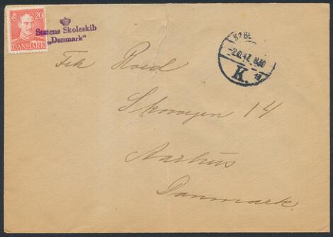 1942. Brev med 20 øre, Chr.X, rød, annulleret med violet liniestempel "Statens Skoleskib Danmark".