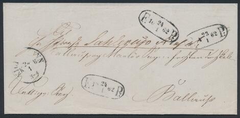 1862. FODPOSTBREV fra København til Ballerup, med 3 SORTE FODPOSTSTEMPLER (2 forskellige datoer).