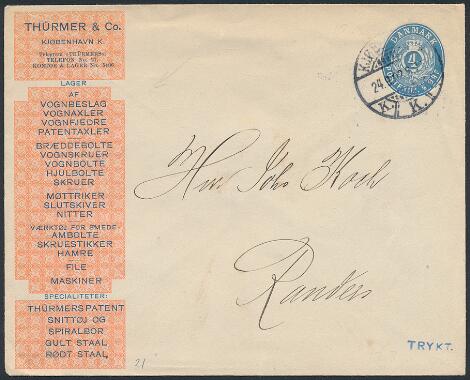 1902. Smuk 4 øre, helsag med REKLAME i venstre side af kuverten fra "THÜRMER & Co."