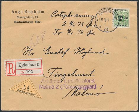 1918. 27/8 øre, grøn. Korrekt på som single frankering på anbefalet Postopkrævning sendt til Sverige, stemplet i KJØBENHAVN 20.11.18. Sjælden forsendelse.